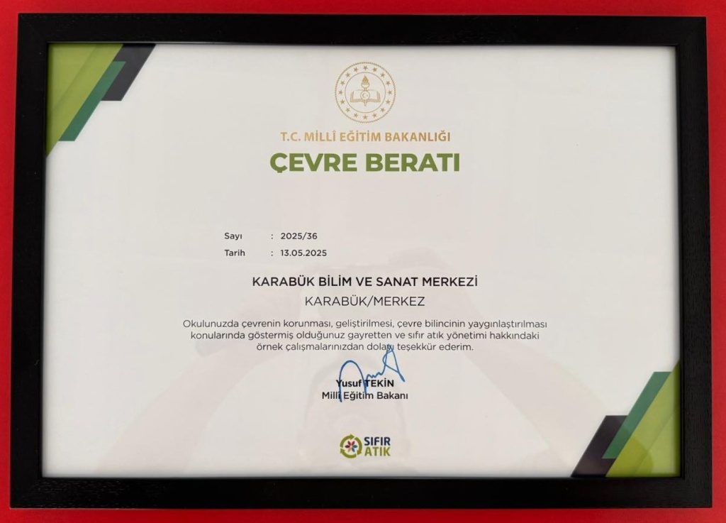 Bu seçkin başarı, okulumuzun Bakanımız Sayın Yusuf Tekin tarafından takdirle layık görüldüğü "Çevre Beratı" ile taçlandırılmıştır.